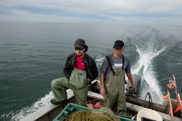 Slieman al-Jasem, right, learns how to steer the boat while Kendall Dewey sets out gill nets in Lake Ontario around Prince Edward County. Mr. Dewey and his wife, Joanne, run the county's only remaining fish processing operation.JOHNNY C.Y. LAM/The Globe and Mail