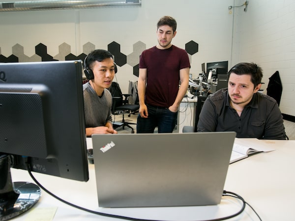 Meddo CEO Ben Brubaker-Zehr, centre, works with software developers Mike Chong, left, and Dan Szekely in the company’s Kitchener, Ont., office.Glenn Lowson/The Globe and Mail