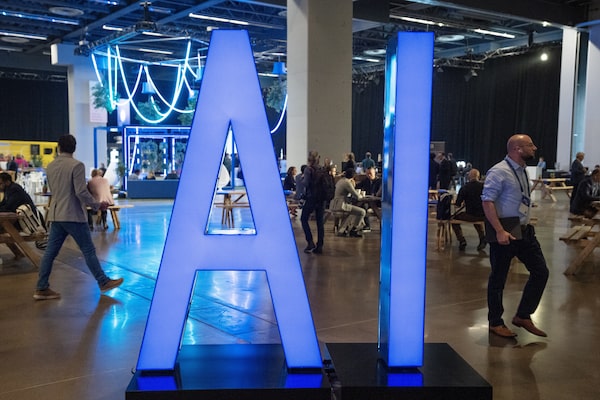 People walk past an AI sign at a conference in Montreal, on Sept. 28, 2023.Ryan Remiorz/The Canadian Press