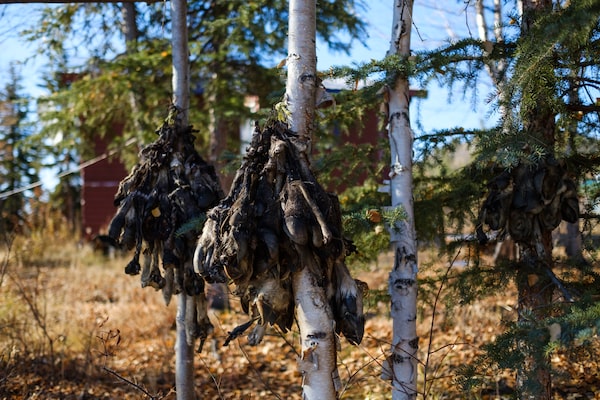 Dried caribou hooves and tendons are hung from trees. These can be used for making broth when caribou meat is scarce.Weronika Murray/The Globe and Mail