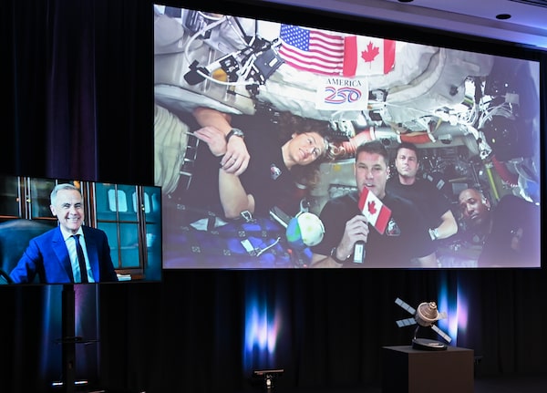 Prime Minister Mark Carney, left, speaks to Artemis II mission astronauts, left to right, Koch, Hansen, Reid Wiseman and Victor Glover during a live feed at the Canadian Space Agency headquarters in Longueuil, Que., on April 8.Graham Hughes/The Canadian Press