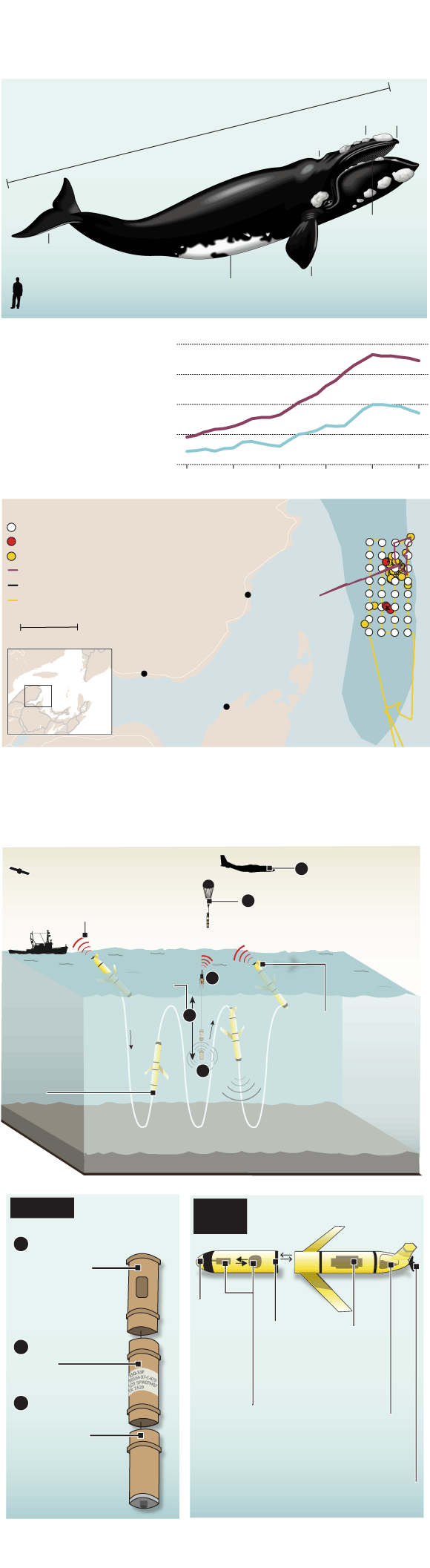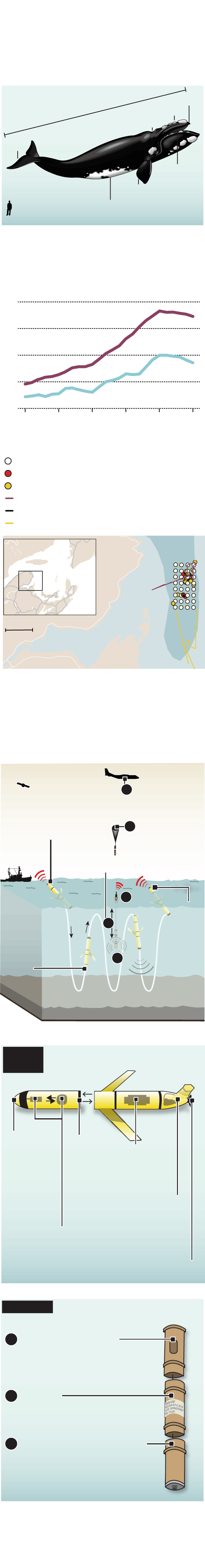 All told, Canadian and U.S. expert observers identified about 30 to 40 whales from plane and survey boat, while two autonomous gliders were underwater recording whale calls. Overhead, a passing satellite simultaneously measured ocean conditions. Finally, and most crucially, were the 32 sonobuoys – sensitive underwater microphones that are designed to hunt for submarines – that the Canadian air force deployed in the same location from a C-140 maritime patrol aircraft. Together, the academic, government and military contributions added up to an unprecedented snapshot of right-whale activity across 1,500 square kilometres of open ocean.