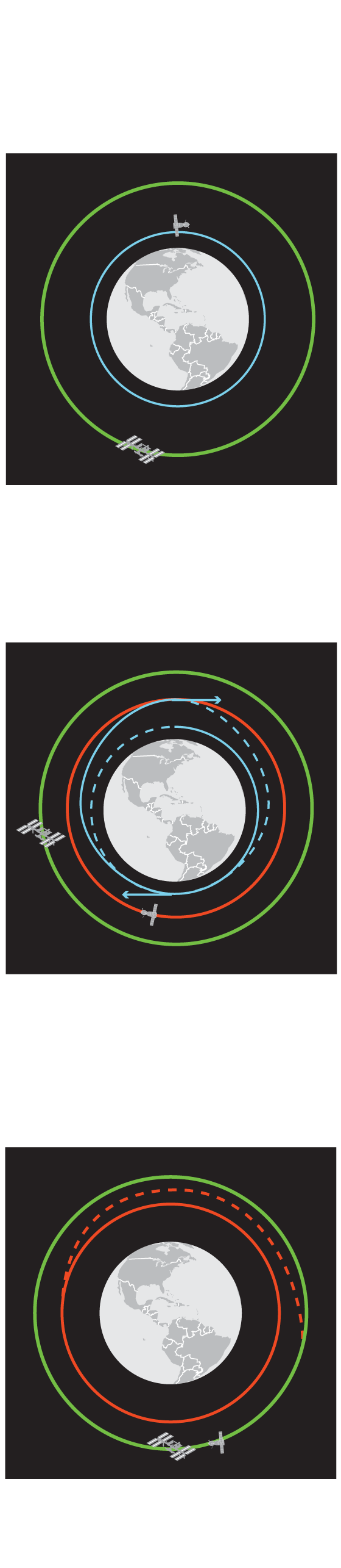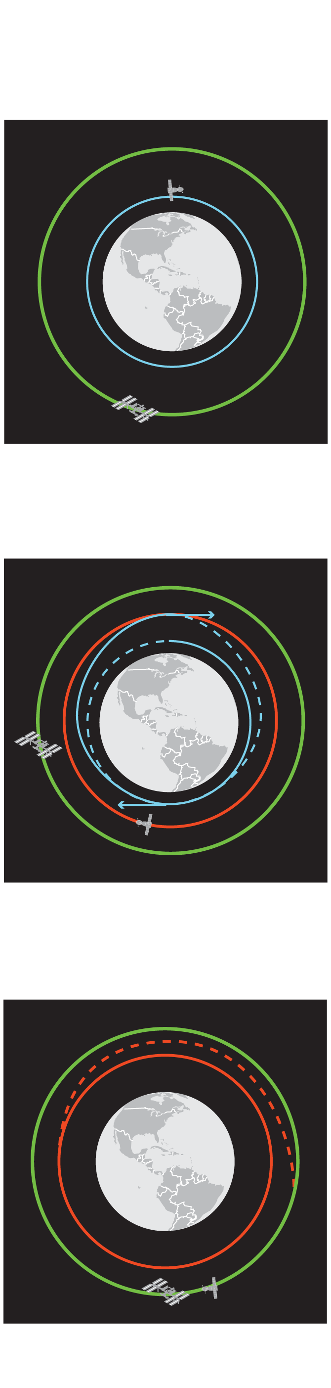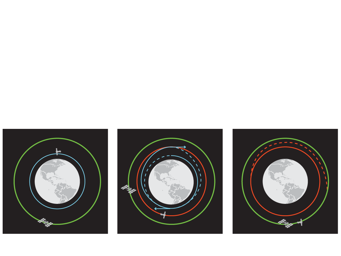 to a higher orbit (red), about 100 kilometres lower than the station’s, by using a fuel efficient “Hohmann