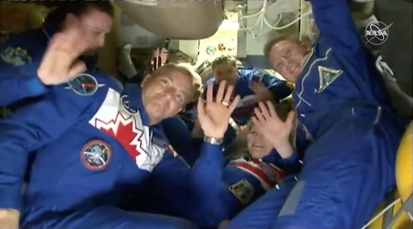 Canadian Space Agency astronaut David Saint-Jacques waves upon uniting with the rest of the crew members on the International Space Station on Dec. 3, 2018.NASA/Reuters