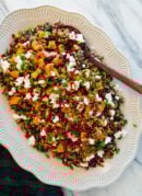 This vibrant vegetarian stuffing recipe features roasted butternut squash, kale, pomegranate and wild rice. It’s a beautiful dish for your holiday table! This recipe yields 6 to 12 servings (a lot!). You can cut this recipe in half, if desired.