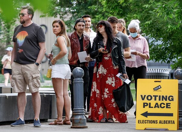 Voters line up to cast their ballots on election day in Calgary.Jeff McIntosh/The Canadian Press