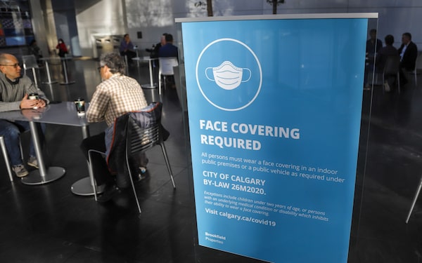 A sign instructs people to wear masks in downtown Calgary on Oct. 30, 2020.Jeff McIntosh/The Canadian Press