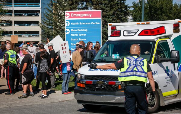 Protesters gather at the Foothills Hospital in Calgary on Sept. 13. Premier Jason Kenney made his last attempt at controlling the COVID-19 spread on Sept. 3, when he announced a provincewide mask mandate, a curfew on liquor sales and a $100 incentive to get the vaccine.Jeff McIntosh/The Canadian Press