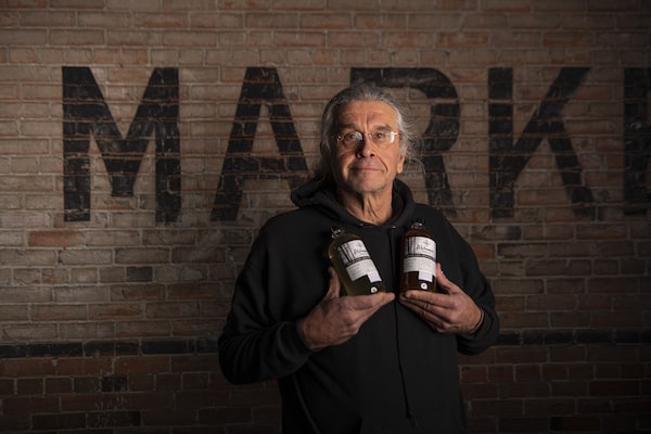 Paul Poutanen, owner of Tippa Distillery, shows off his Alchemist Vinegar at the Christmas Market at The Pioneer in downtown Calgary on Dec. 12.Gavin John/The Globe and Mail