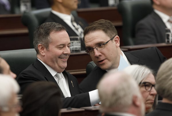 Alberta Premier Jason Kenney and Jason Nixon in Edmonton on Tuesday May 21, 2019. Government house leader Nixon said Kenney and his United Conservative cabinet ministers are to deliver an update on the pandemic in the house Wednesday and take Opposition questions on the government’s handling of the crisis.JASON FRANSON/The Canadian Press
