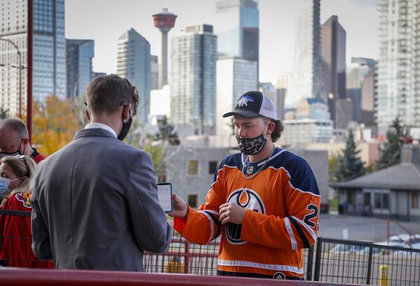 An Edmonton Oiler fan has their COVID-19 vaccination proof checked before entering the Saddledome for pre-season NHL hockey action in Calgary on Sept. 26, 2021.Jeff McIntosh/The Canadian Press