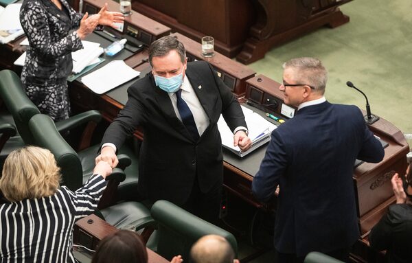Alberta Premier Jason Kenney fist bumps an MLA after Finance Minister Travis Toews delivered the 2022 budget in Edmonton on Feb. 24, 2022.JASON FRANSON/The Canadian Press