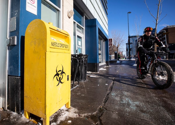 Calgary police patrol the streets near the cities drug safe injection site in Calgary, on Feb. 21, 2019.Todd Korol/The Globe and Mail