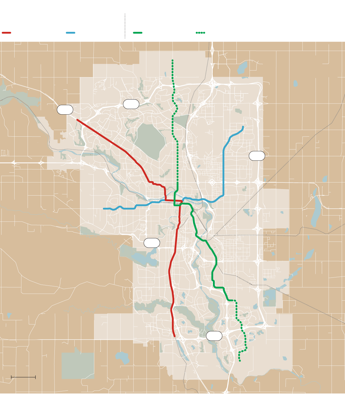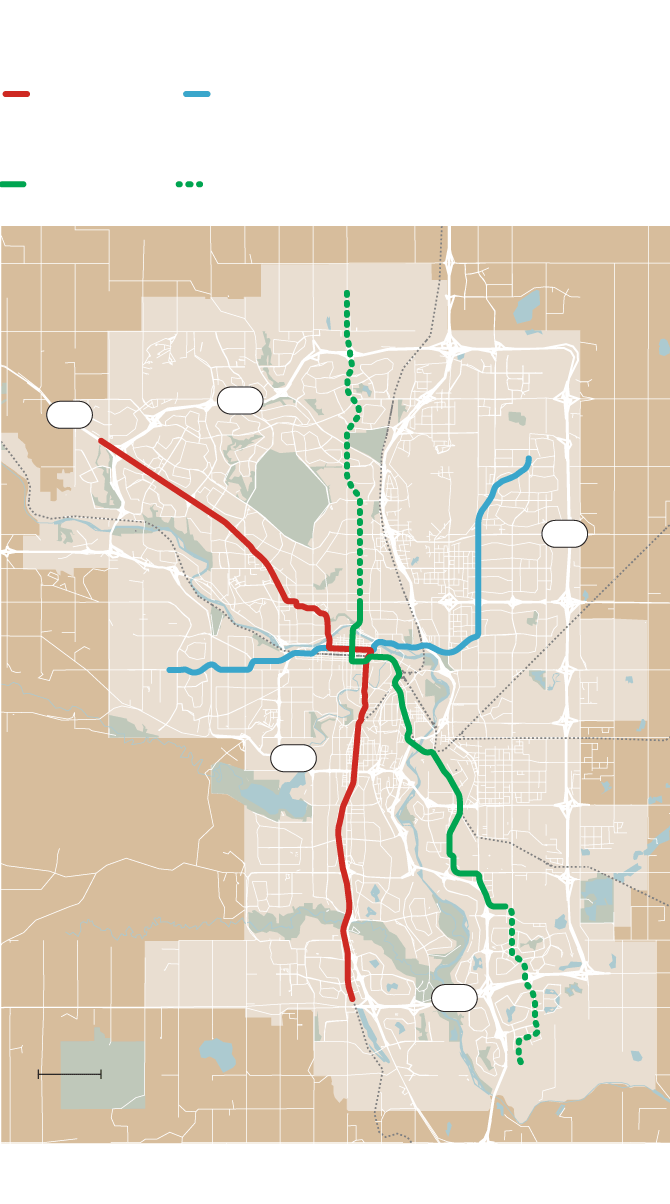 Calgary’s two existing light-rail lines merge and cross downtown at street level. A Green Line built through downtown would be perpendicular to that transit way.