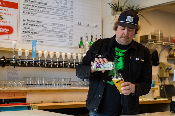 Benjamin Leon, one of the owners and founders of Dandy Brewing, pours beer from their new can designs in Calgary on April 2.Jude Brocke/The Globe and Mail