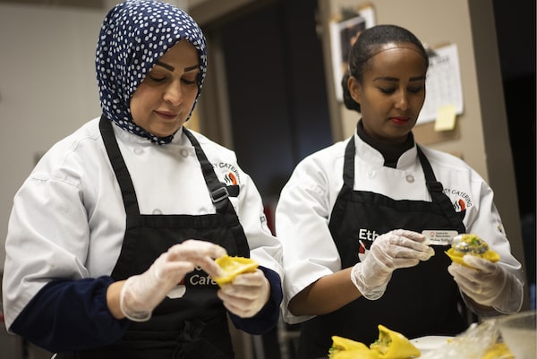 Entisar Gate, left, from Iraq and Helen Telila from the Philippines make samosas in the kitchen of EthniCity Catering. The business is a fully operational catering company and cafe that trains newcomers in the working kitchen and helps them find employment.TODD KOROL/The Globe and Mail