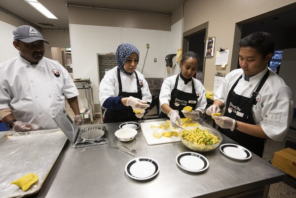 The catering menu is vast and touches on a variety of cultures, with items such as beef bourekas (Palestinian), Egyptian-spice falafels, sega wot and injera (Ethiopian), as well as Arabic mujaddara. The catering company’s students are trained through a 12-week program, in hopes of providing them with food service skills they can then use to find work.