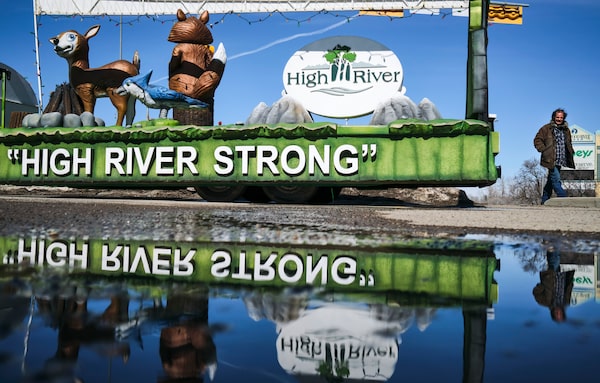 A parade float encourages residents to stay strong in High River, Alta., March 27, 2020, amid the worldwide COVID-19 pandemic. Health officials said that as of Friday, 358 cases in High River and elsewhere in the region were linked to the nearby Cargill facility.Jeff McIntosh/The Canadian Press
