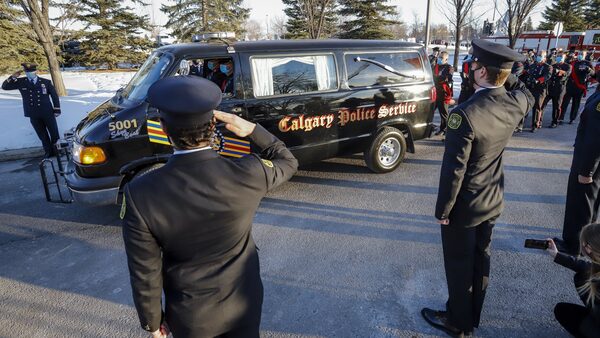 Officers salute as the hearse and honour guard pass at the funeral service for Sgt. Andrew Harnett in Calgary on Jan. 9, 2021.Jeff McIntosh/The Canadian Press