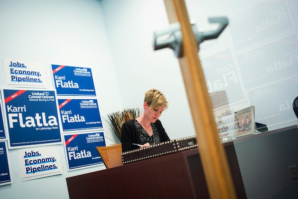 The United Conservative Party candidate in Lethbridge-West, Karri Flatla, reads up on policy in her office.