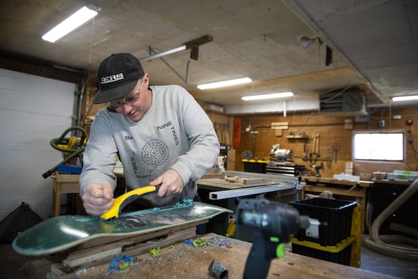 Stacks of broken and worn skateboards, blocks of colourful wood, and bowls in various stages of construction pack a garage workshop in Calgary.