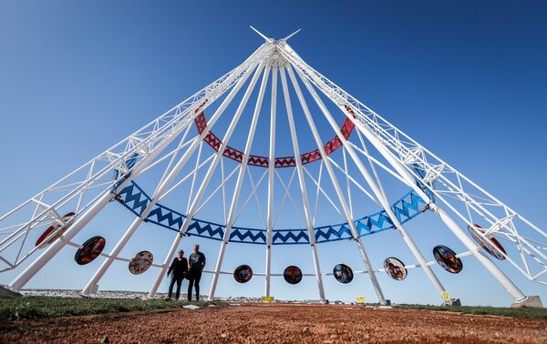 A couple walks underneath the Saamis Teepee, a landmark built in Medicine Hat for the 1988 Calgary Olympics that is billed as the tallest teepee in the world.