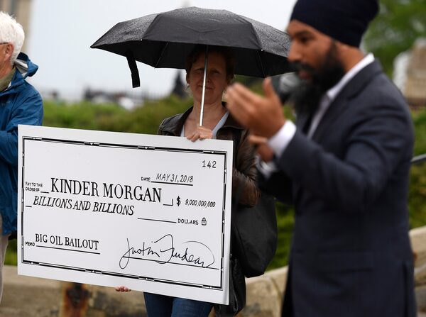 NDP Leader Jagmeet Singh speaks on Parliament Hill in 2018 as a woman, holding a novelty cheque made out to oil company Kinder Morgan, takes part in a protest against the Trans Mountain pipeline expansion.Justin Tang/The Canadian Press