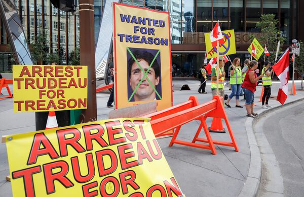 Calgary, July 13: Yellow Vest protesters gather outside a Liberal fundraiser with signs accusing Mr. Trudeau of 'treason.'Jeff McIntosh/The Canadian Press