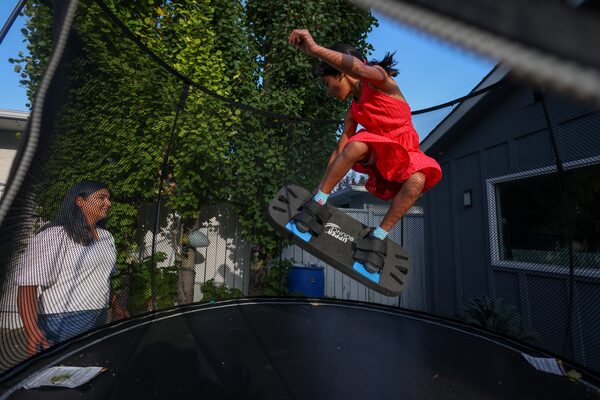 Amaya practices her form on the family's trampoline as her mom Madiha looks on. Below, she skateboards around the kitchen island at her family’s home in Calgary.