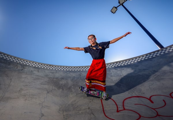 Rae Marie First Charger, 10, skateboarding in her ribbon skirt at a skate park in Lethbridge, Alta., on Oct. 8, 2022.Photography by Leah Hennel/The globe and Mail