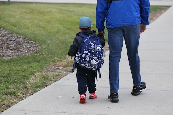 Dr. Ravi Patel walks with his son Krish (3) as he drops him off for school at the Calgary French and International School on Sept. 14, 2010. This year, with kids returning to class amid the pandemic, parents and staff have varied access to information about potential COVID-19 exposures, depending on their school district and social networks.Dave Chidley/The Globe and Mail