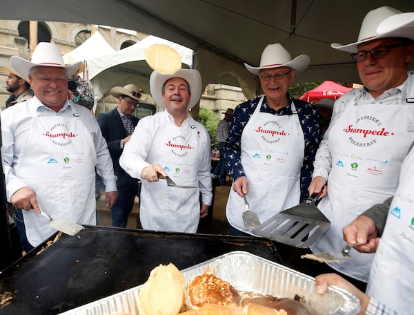 Ontario Premier Doug Ford flips a pancake with former Alberta Premier Jason Kenney, New Brunswick Premier Blaine Higgs and Saskatchewan Premier Scott Moe at the Premier's Stampede breakfast on July 8, 2019.TODD KOROL/Reuters