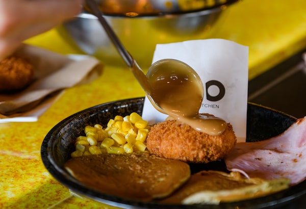 Eric Sit, president of Omo Teppan & Kitchen, with a serving of their pancake breakfast in Calgary on June 30.Jude Brocke/The Globe and Mail