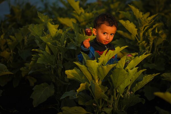 The farm children – like Munzer, holding an eggplant in the greenhouse, and Aisha and Abir, jumping on a trampoline during the harvest – sometimes play with the children of customers who come to visit.