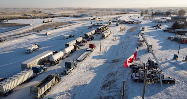 A truck convoy of anti-COVID-19 vaccine mandate demonstrators continue to block the highway at the busy U.S. border crossing in Coutts, Alta., on February 2, 2022. A local Alberta politician facing charges for participating in "Freedom Convoy" protests at the Coutts border blockade is set to testify Tuesday at the public inquiry into the federal government’s use of the Emergencies Act. THE CANADIAN PRESS/Jeff McIntoshJeff McIntosh/The Canadian Press