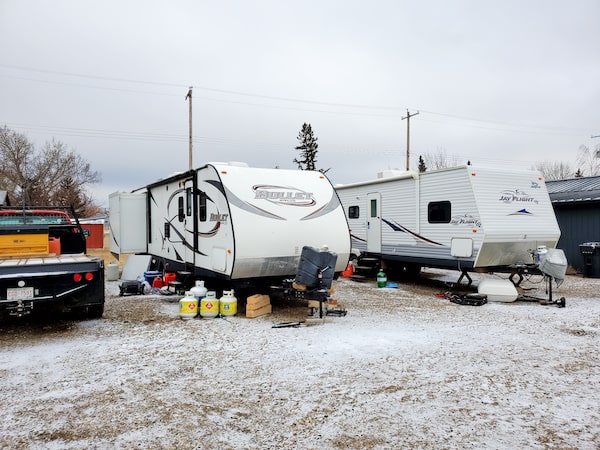 One of the campers in the yard bore the slogan “Lets Go Brandon!,” a political slam at U.S. President Joe Biden. Outside, there was a case of Pilsner beer and a barbecue, along with coolers, gas cans and propane tanks.