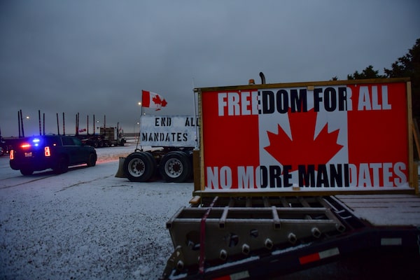 An RCMP vehicle patrols several vehicles participating in the blockade in the early morning just prior to its conclusion, in Coutts, Alta, on Feb. 15.Gavin John/The Globe and Mail