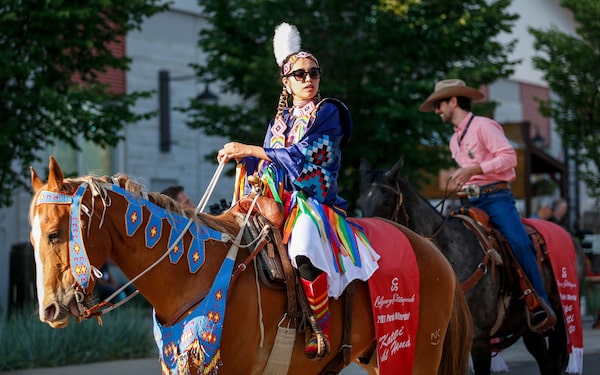 Calgary Stampede parade marshal Katari Right Hand leads the parade.Jeff McIntosh/The Canadian Press