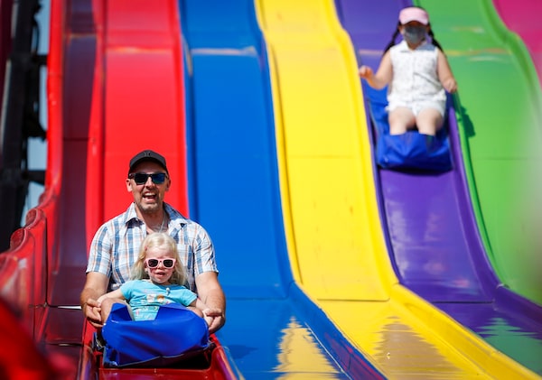 A father and his daughter enjoy a ride at the Calgary Stampede.Jeff McIntosh/The Canadian Press