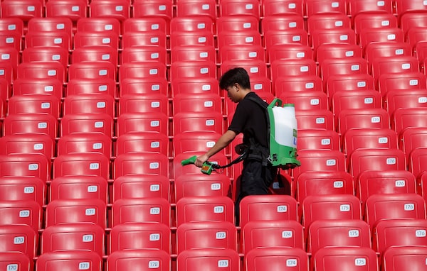 A Stampede worker sanitizes seats before the start of the rodeo.TODD KOROL/Reuters