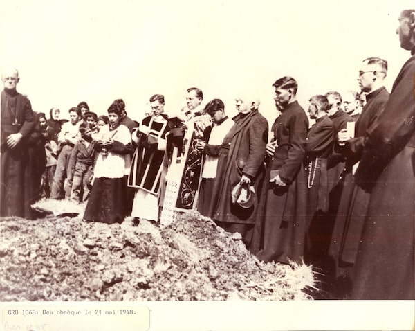 Larry Loyie at St. Bernard Mission residential school, is the altar boy in white cassock on the left, attending a priest's funeral at St. Bernard Mission, Grouard, Alberta. Photo: Courtesy La Societe Historique et Genealogique de Smoky River, Donnelly, ABSupplied