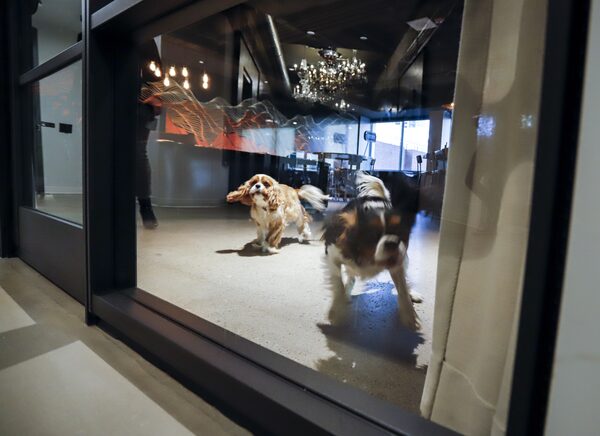 Rocco, right, and Benny greet visitors to the offices of Fuelled in the Edison Building in downtown Calgary, on Nov. 10.Jeff McIntosh/The Globe and Mail