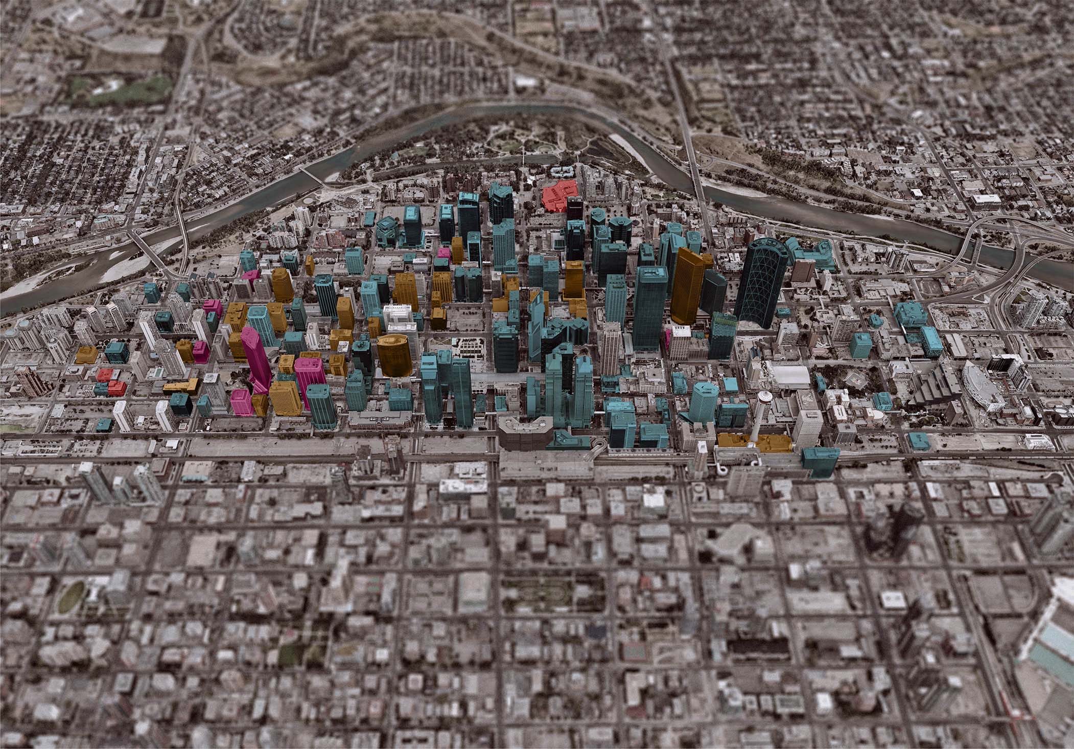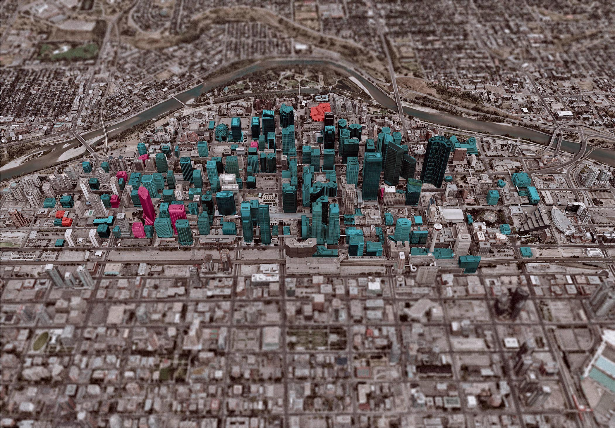 Vacancy data for this project were provided by Avison Young and are current to Q2 2021. Mapping was done by joining data with Open Street Maps building footprints using GIS software. They were manually verified and then rendered over Google Earth 3D imagery.
