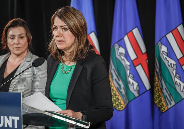 United Conservative Party Leader Danielle Smith, right, makes an election campaign announcement in Calgary on May 11.Jeff McIntosh/The Canadian Press