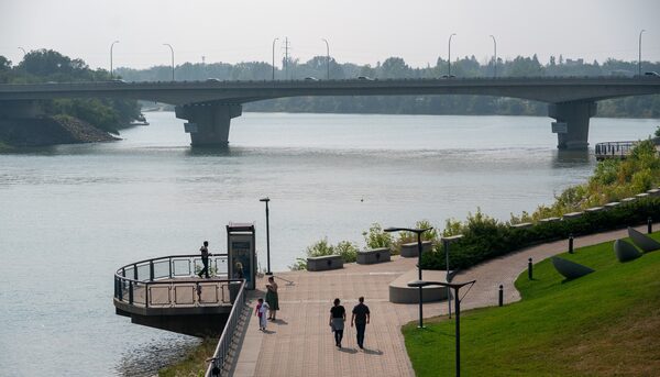 People walk by the South Saskatchewan River in Saskatoon, Sask., as wildfire smoke blankets the city on Aug. 15.Heywood Yu/The Globe and Mail