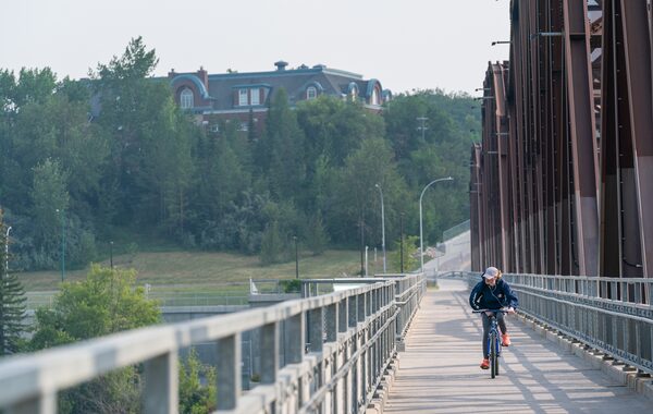 A person cycles on Victoria Bridge by the South Saskatchewan River in Saskatoon, Sask., as wildfire smoke blankets the city on Thursday, August 15, 2024.Heywood Yu/The Globe and Mail