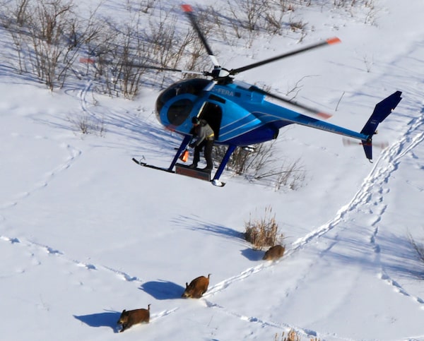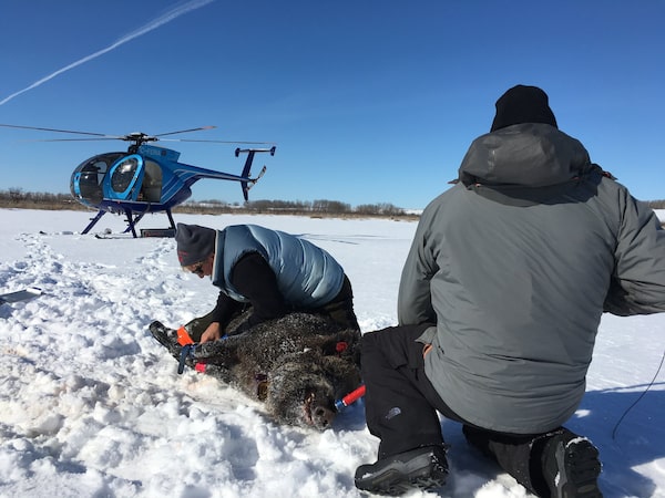 University of Saskatchewan research teams capture wild pigs in the winters of 2016, top, and 2017, so they can be tagged with GPS collars. The animals' size and strength makes live capture difficult.Ryan Brook/University of Saskatchewan
