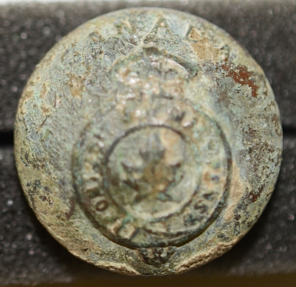 A Canadian General Service button inscribed with 'Canada' found with the remains of Private Priddle. A maple leaf is seen in the centre of The Order of The Garter.DND photo