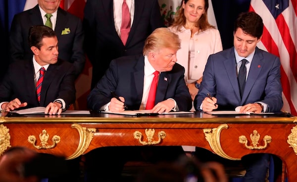 Nov. 30, 2018: U.S. President Donald Trump, middle, looks over at Canadian Prime Minister Justin Trudeau's document at the USMCA official signing in Buenos Aires. At left is Mexico's then-president, Enrique Pena Nieto.Martin Mejia/The Associated Press