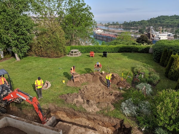 Stage 3, the hunt to discover the nature and extent of any “Euro-Canadian” remains (that is, from the Anglican churchyard), was under way by the end of May, 2018. The soil on both sides of the new concrete retaining wall of the patio was fully excavated to a depth of four feet – that’s where you encounter coffin edges, if you’re going to encounter them – and screened through six-millimetre wire mesh. Then, as per the law, everything within 10 metres of the spot where the skull had been found was dug up in three phases to a depth of 30 centimetres. (Had the excavators found other remains or coffin hardware, they would have been obligated to excavate another 10 metres from those relics, too.) The yard looked as if it had been hit by a small meteor.